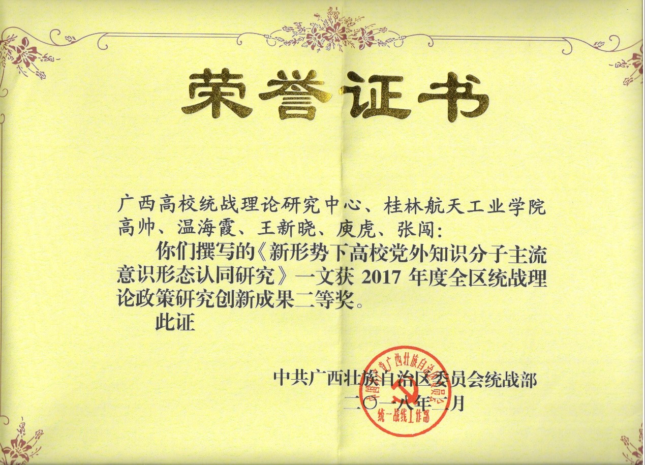 2018-03我校研究成果获2017年度全区统战理论政策研究创新成果二等奖