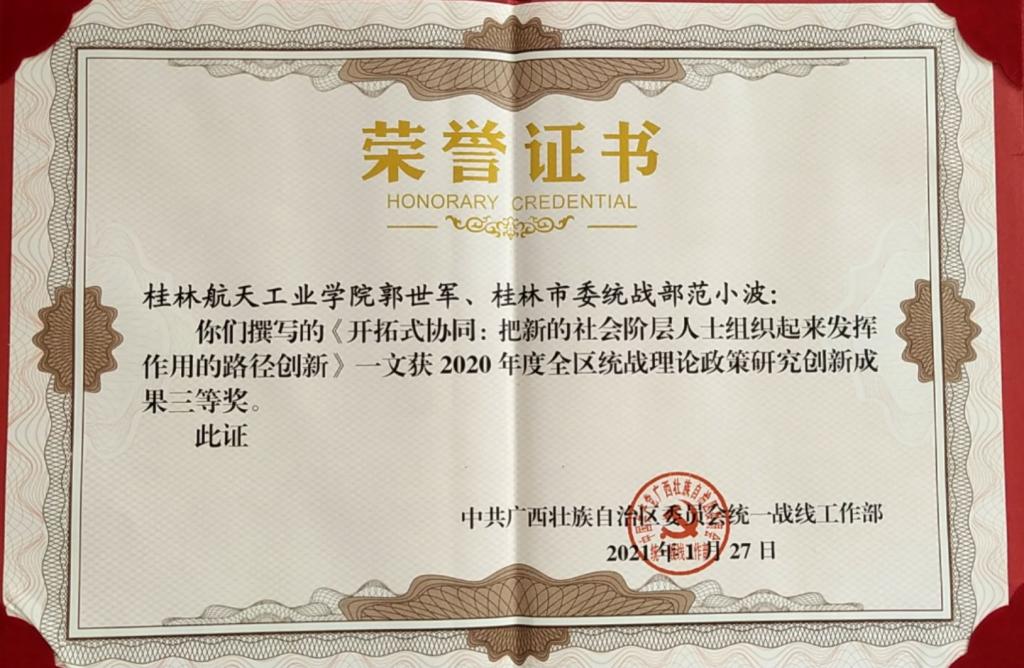近日,2020年广西理论政策研究创新成果奖公布,我校教师郭世军博士和桂林市统战部范小波联合撰写的《开拓式协同:把新的社会阶层人士组织起来发挥作用的路径创新》,获得2020年度全区统战理论政策研究创新成果...