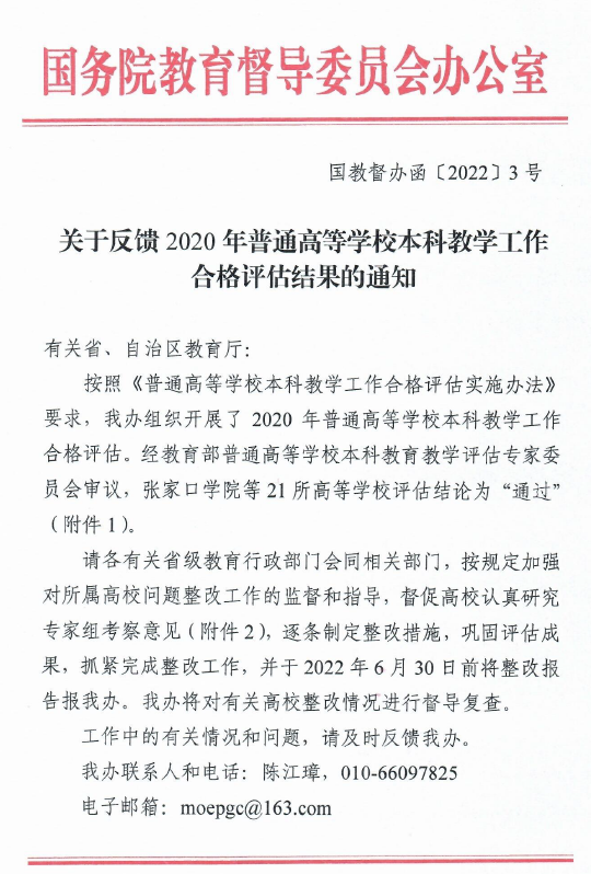 近日,国务院教育督导委员会办公室下发了《关于反馈2020年普通高等学校本科教学工作合格评估结果的通知》(国教督办函[2022]3号),正式公布了评估结果为“通过”的高校名单,我校顺利通过了2020年教育部本科教...