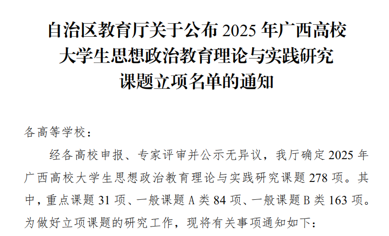 近日,自治区教育厅公布《2025年广西高校大学生思想政治教育理论与实践研究课题立项名单的通知》(桂教思政〔2025〕11号),我校有5个课题获得立项,分别为:唐昕主持的《AI时代大学生“提问失语”的现象生成与主...