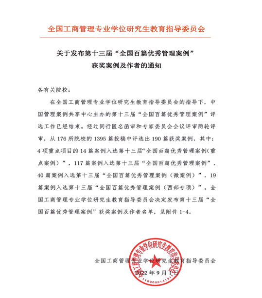 2022-09【喜报】我校案例入选第十三届“全国百篇优秀管理案例”