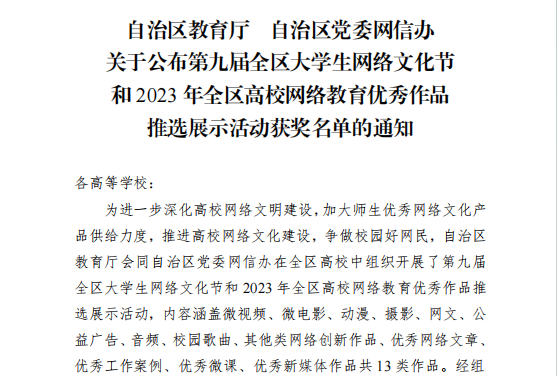 近日,根据自治区教育厅、自治区党委网信办联合下发的《自治区教育厅 自治区党委网信办关于公布第九届全区大学生网络文化节和 2023 年全区高校网络教育优秀作品推选展示活动获奖名单的通知》(桂教思政〔2023〕31...