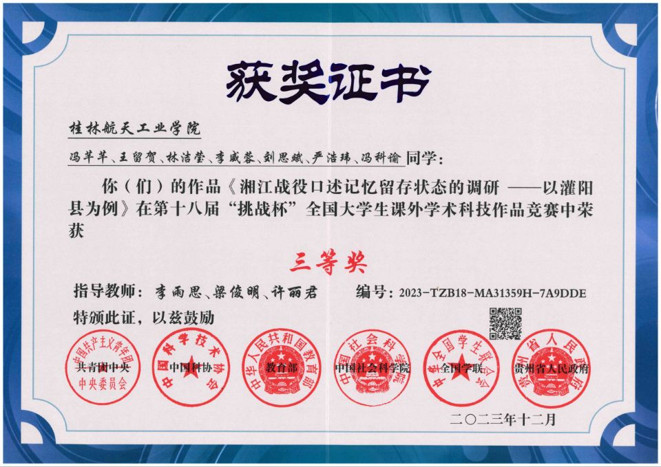 近日,由共青团中央、中国科协、教育部、中国社会科学院、全国学联、贵州省人民政府共同主办的第十八届“挑战杯”全国大学生课外学术科技作品比赛结果正式公布,我校再创佳绩,《湘江战役口述记忆留存状态的调研...