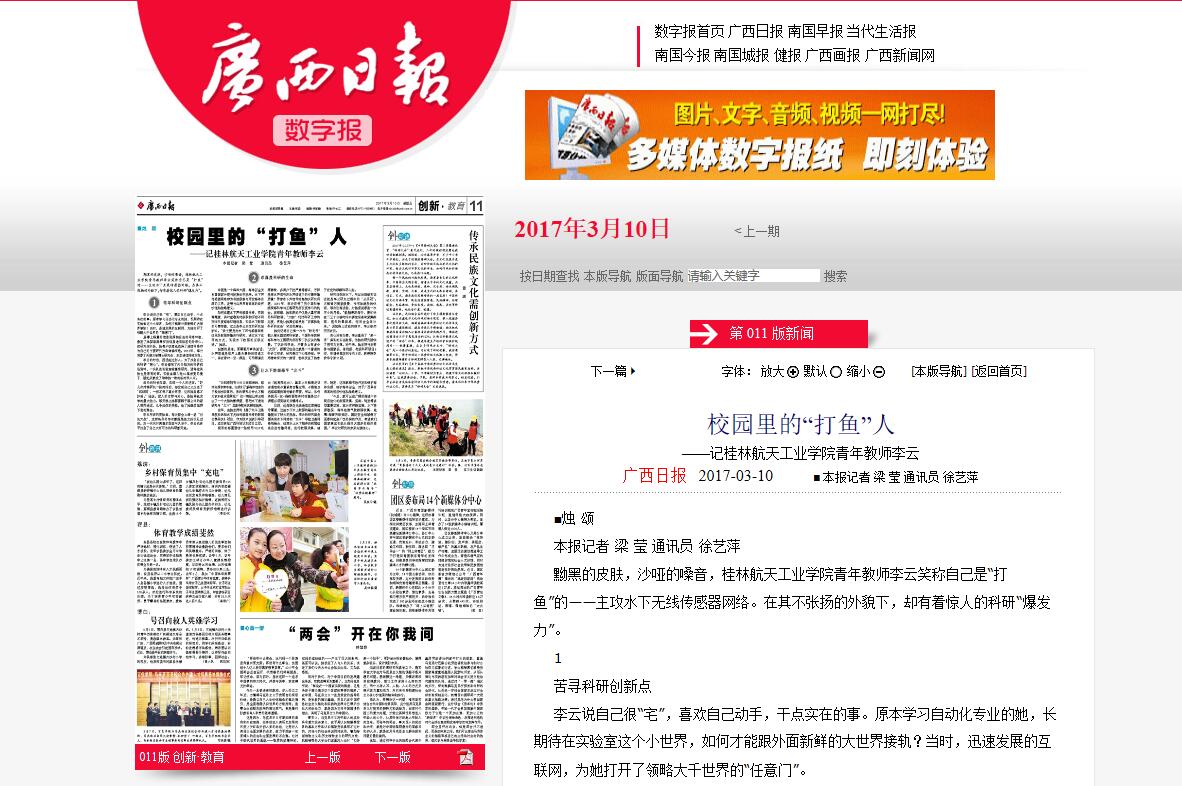 新闻链接http://gxrb.gxnews.com.cn/html/2017-03/10/content_1369669.htm 黝黑的皮肤,沙哑的嗓音,华体会平台青年教师李云笑称自己是“打鱼”的——她主攻水下无线传感器网络。在其不张扬的外貌下,...