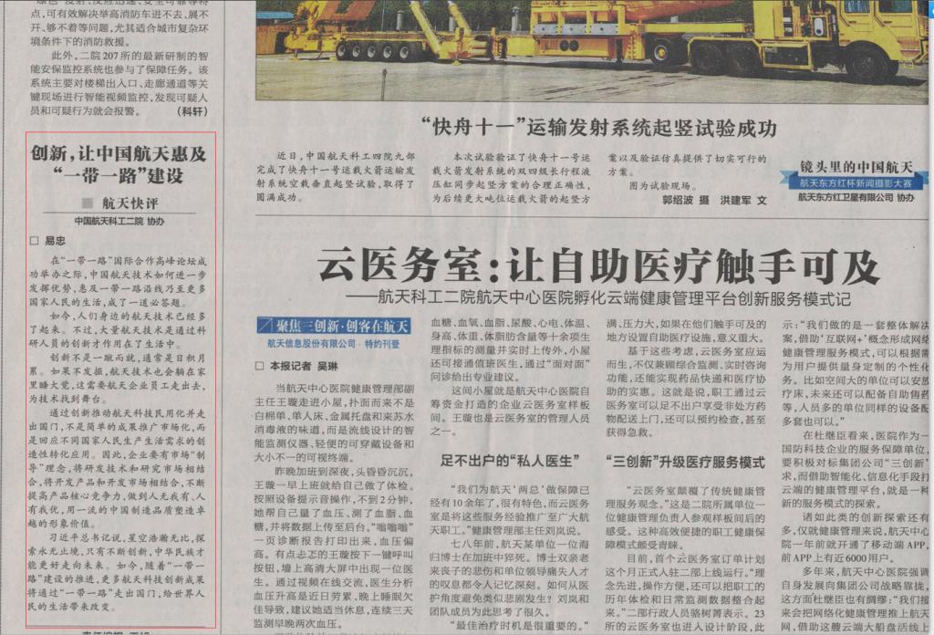 在“一带一路”国际合作高峰论坛成功举办之际,校长易忠在《中国航天报》头版发布理论评论:创新,让中国航天惠及“一带一路”建设 易忠 在“一带一路”国际合作高峰论坛成功举办之际,中国航天技术如何进一步发...