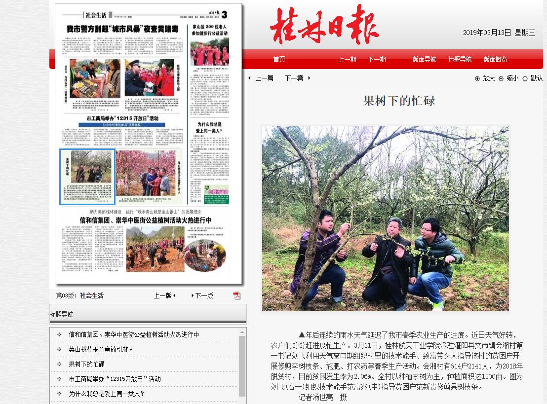 新闻链接:http://epaper.guilinlife.com/glrb/html/2019-03/13/content_1719821.htm?div=-1 年后连续的雨水天气延迟了我市春季农业生产的进度。近日天气好转,农户们纷纷赶进度忙生产。3月11日,桂林航天工业...