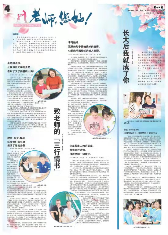 编者按 今天是我国第37个教师节,本报推出《老师,您好!》特别策划,致敬平凡又伟大的人类灵魂工程师。 该策划分三个篇章,主题分别为《致老师的“三行情书”》《特别的我,感谢特别的您》和《长大后...