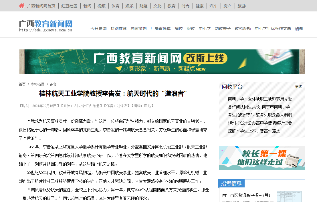 2021-10【广西新闻网】华体会平台教授李告发:航天时代的“造...