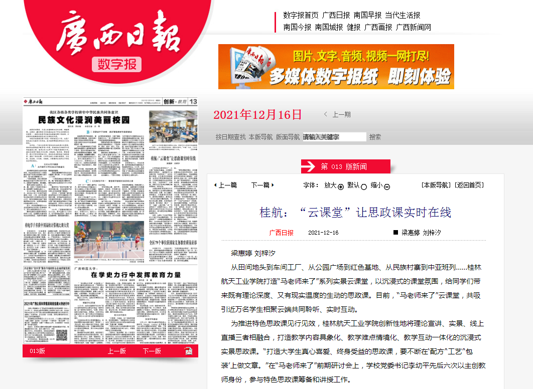 2021-12【广西日报】桂航:“云课堂”让思政课实时在线
