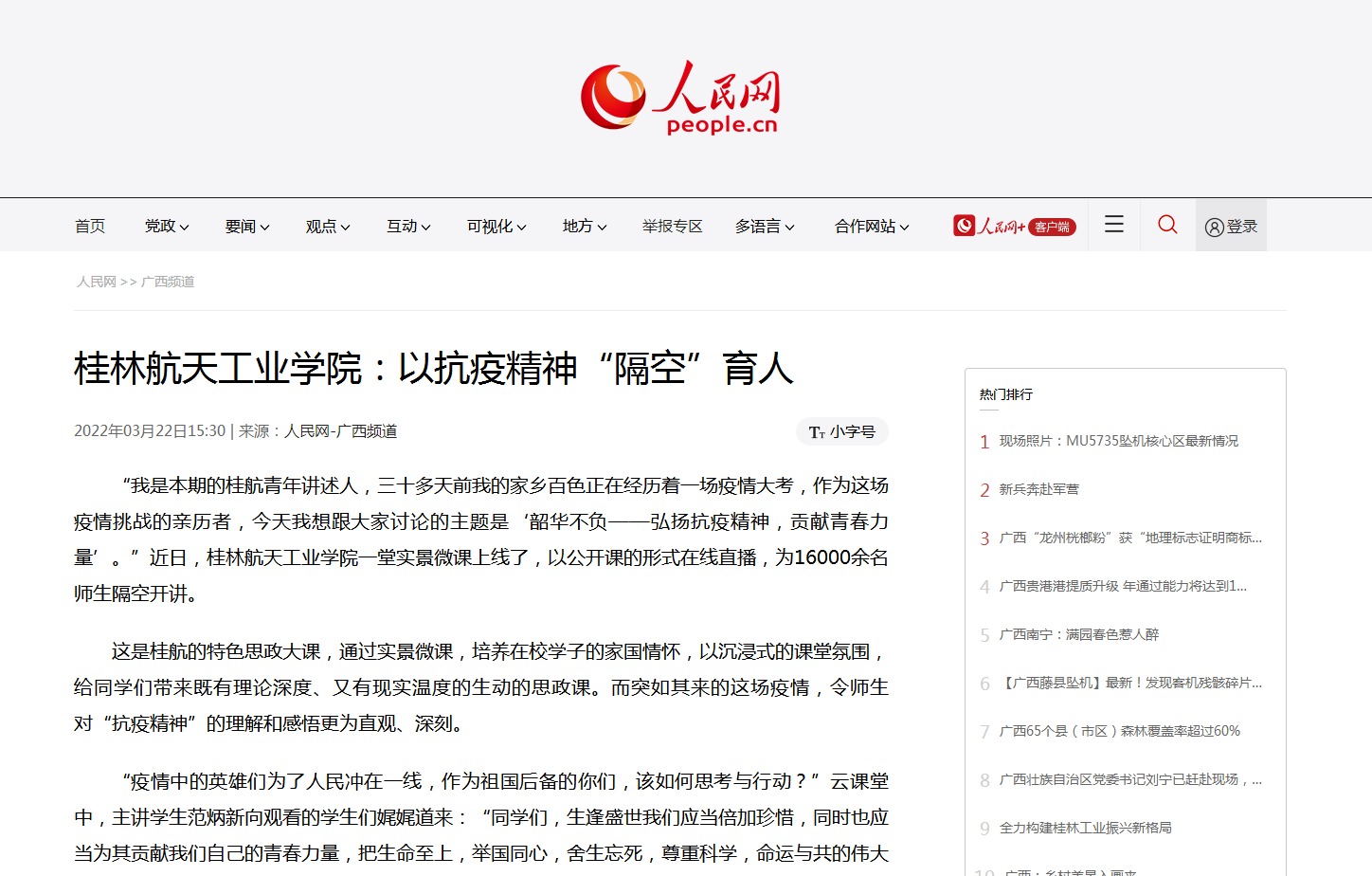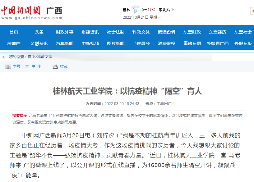 中新网广西新闻3月20日电(刘梓汐)“我是本期的桂航青年讲述人,三十多天前我的家乡百色正在经历着一场疫情大考,作为这场疫情挑战的亲历者,今天我想跟大家讨论的主题是“韶华不负——弘扬抗疫精神,贡献青春力...