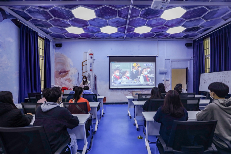 3月23日,神舟十三号飞行乘组航天员翟志刚、王亚平、叶光富默契配合,以天地对话方式,在中国空间站为广大青少年上了精彩的“天宫课堂”第二课。我校各学院、社团组织和创新实践团队等学生代表分别在北校区航天科...