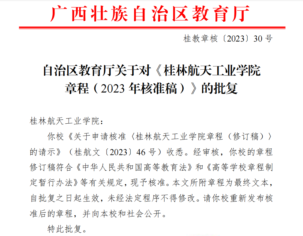 日前,自治区教育厅签发《广西壮族自治区教育厅关于<华体会平台章程(2023年核准稿)>的批复》(桂教章核〔2023〕30号)。核准书载明,根据《中华人民共和国高等教育法》和《高等学校章程制定暂行办法》等相...