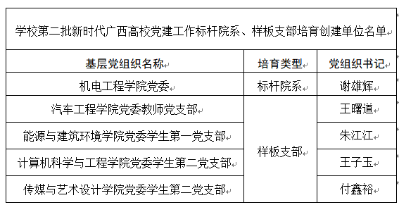 近日,自治区党委教育工委公布第二批新时代广西高校党建示范创建和质量创优工作培育创建单位评选结果。我校机电工程学院党委获评为广西高校党建工作“标杆院系”培育创建单位。汽车工程学院党委教师党支部、能源...