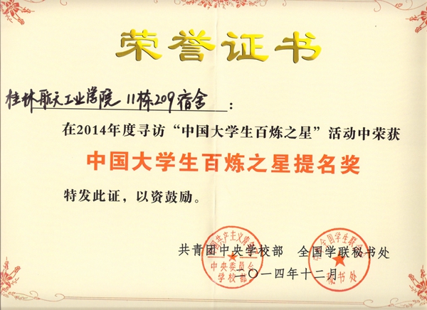 近日,由团中央学校部、全国学联秘书处组织开展的2014年度寻访“中国大学生百炼之星”活动结果揭晓,我校北校区11栋209宿舍 (汽车工程系2014级汽车服务工程专业)荣获2014年度“中国大学生百炼之星”提名奖。