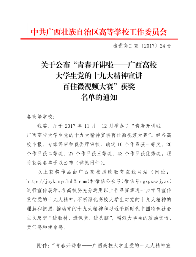 日前,由自治区高工委、自治区教育厅举办的“青春开讲啦——广西高校大学生党的十九大精神宣讲百佳微视频大赛”,由我校推选的微视频作品《美好生活的青春交响》在比赛中荣获一等奖。该作品由马克思主义学院高帅老师策划指导,机械工程学院的李晓斌等同学参与拍摄、制作。
