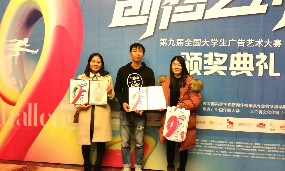 近日,第九届全国大学生广告艺术大赛全国颁奖典礼近日在北京政协礼堂举行,传媒与艺术设计学院师生在此次大赛中获得二等奖一名、三等奖两名的优异成绩,并应邀参加了颁奖典礼。