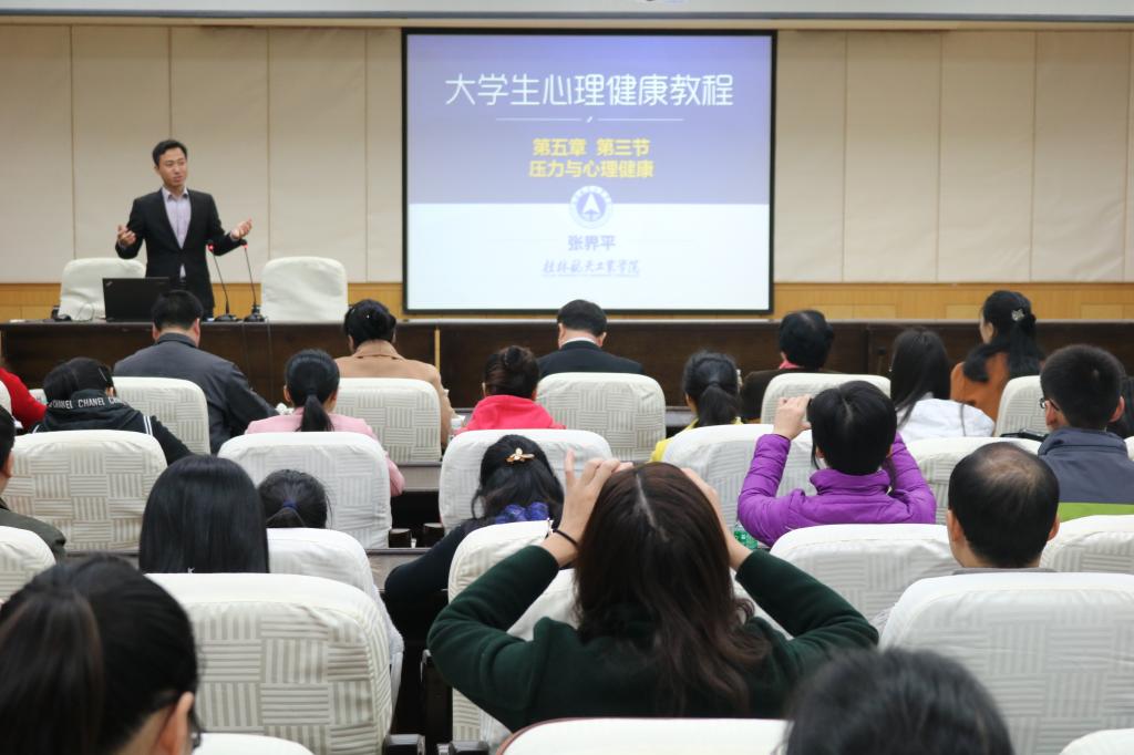 本届广西高校大学生心理健康教育课教学大赛由初赛和决赛两个环节组成。来自全区各高校推荐的52名心理健康教育课教师参赛,其中15位选手进入决赛。决赛以现场说课和答辩的形式进行,参赛选手就初赛阶段所讲授的教学内容以说课形式展示教学理念、教学目标、教学重点难点、教学方法、教学过程和教学反思等,然后由专家评委现场提问。我校张界平教师对广西教育厅组织编写、广西师范大学出版社出版的教材《大学生心理健康教程》第五章大学生的适应与心理健康的第三节压力与心理健康进行了说课,充分展示自己的教学理念、教学过程等,表现优异,荣获二等奖。比赛结束后,评委组组长、广西师范学院李继兵教授作了精彩点评。