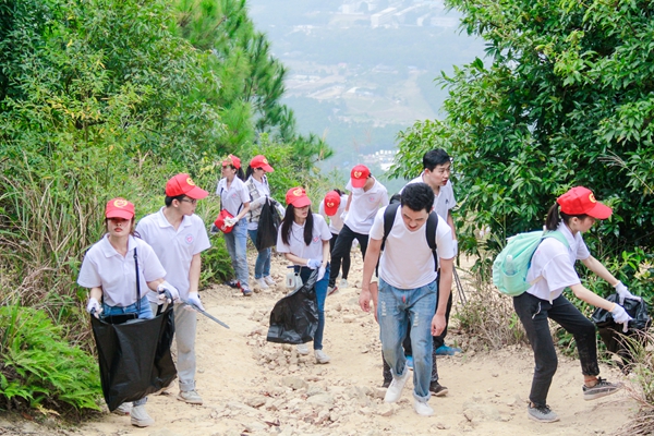 易忠带领师生们徒步向山顶攀登,并在沿途开展清洁尧山环保活动。大家把道路旁树丛里的垃圾一一清理出来,分别装进垃圾袋,再由学校统一收集运送到环保清洁指定地点。师生们头戴红色的志愿者帽子,点缀着漫山的翠绿,宛如一条移动的彩带蜿蜒山间。