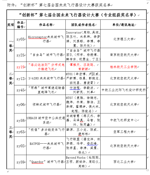 由中国航空学会与中国航空工业集团公司联合主办的“创新杯”第七届全国未来飞行器设计大赛,经过近半年的分赛区评选和最终全国评选,我校学生谭棋天团队的作品——“洛必达法则”分布式电力推进飞机,获得专业组二等奖(全国第三名)。