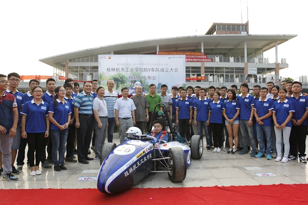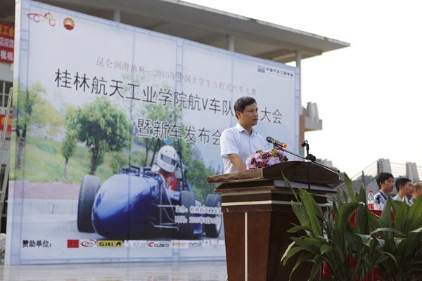 9月16日下午,由我校师生自主创新设计制造的方程式赛车“航V1号”新车正式对外发布。副校长李智,汽车与交通工程学院、传媒与艺术设计系、学工部、校团委主要负责人,以及桂林真龙福福汽车销售有限公司董事长谢庆均、桂林博达汽车科技有限公司总经理黄景中、桂林旅游汽车运输公司总工程师梁荣德、广西艾盛创制科技有限公司部长王彬出席发布会。