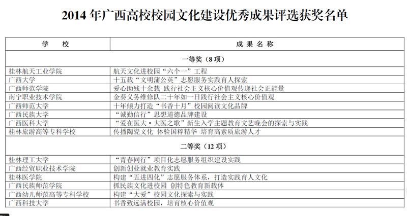 新年伊始,从自治区党委宣传部、自治区高校工委传来喜讯,我校推荐的“航天文化进校园‘六个一’工程”,在广西高校众多校园文化建设的品牌项目中脱颖而出,以优异成绩荣获广西高校校园文化建设优秀成果一等奖的第一名,这标志着我校在文化创新方面取得了阶段性的成果。
