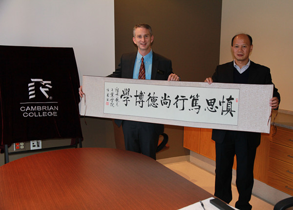 在加拿大凯布莱恩应用文理学院访问期间,加方校长 Bill Best、副校长 Sonia C Del Missier、国际交流处主任、国际项目部主任等热情接待了我校代表团。双方就合作的具体问题进行了讨论,并达成了共识。李幼平代表我校与凯布莱恩学校校长Bill Best签署了合作协议。代表团还实地查看了该校的汽车、机电、能源、信息工程等实训室,深入了解了该校在师资、设备、教学等方面与企业紧密联系的办学特色,为我校向应用技术型本科院校转型提供了可借鉴的先进经验。
