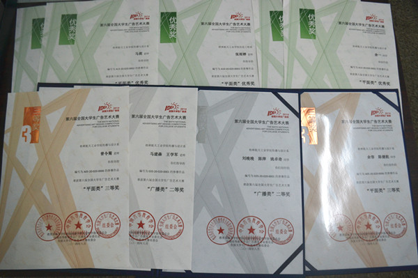 近日,从第六届全国大学生广告艺术大赛组委会传来喜讯, 我校师生在此次大赛中成绩喜人, 获得广西赛区一等奖1项、二等奖8项、三等奖7项,优秀奖13项的优异成绩。赛区获奖作品报送参加全国评比,荣获全国二等奖1项、三等奖1项、优秀奖3项。获奖师生代表应邀参加了11月16日在北京全国政协礼堂举行的颁奖典礼。