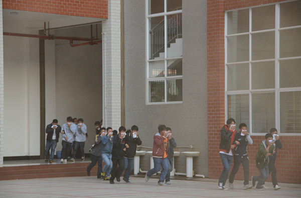 演练中,模拟新实训大楼南侧三楼实验室发生“火灾”后,火势迅速蔓延,烟雾向四周不断扩散,正在实验室上课的学生在教师指挥下开始紧急疏散,按照逃生路线有组织地安全撤离起火教学楼到安全地带。整个疏散演练过程安全、顺利、迅速、有序。
