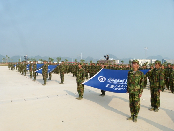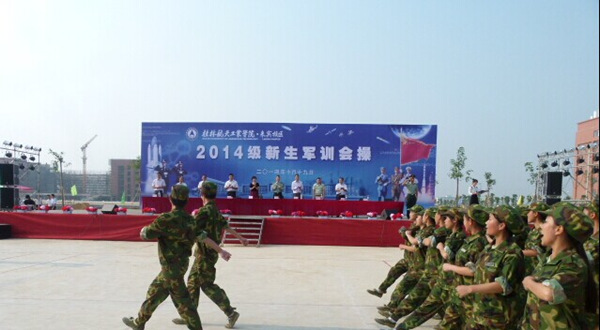 伴随着分列式进行曲,来宾校区2014级新生军训会操大会正式拉开了帷幕。经过军训,同学们表现出了极高的精神素养;嘹亮的口号,昂扬的斗志,无不展现出当代大学生积极进取、奋发向上的精神风貌。在军训会操上,8个受阅营队依次展示自己营队独具特色的队名、口号,同学们动作整齐,目光坚定,迈着铿锵有力的步伐经过主席台,行标准军礼,以军人的姿态接受主席台上领导的检阅。营队英姿飒爽的面貌,整齐肃静的阵容,展现了来宾校区为期10天的军训成果,诠释了军人威武之师的动人形象。嘹亮的口号声此起彼伏,响彻在欣欣向荣的校园中。
