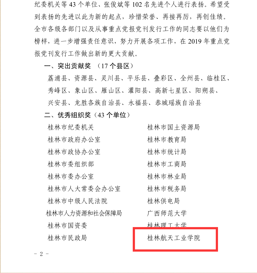近日,桂林市委宣传部印发《关于表扬2018年度重点党报党刊发行和征订工作先进县区、先进单位、先进个人的决定》,我校获评“2018年度重点党报党刊发行和征订工作先进单位”,徐艺萍同志获评“2018年度重点党报党刊发行和征订工作先进个人”。