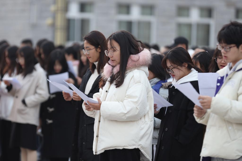 国旗护卫队陈俊潼同学带领在场师生诵读宪法。“中华人民共和国是工人阶级领导的,以工农联盟为基础的人民民主专政的社会主义国家。社会主义制度是中华人民共和国的根本制度……”,伴随着琅琅诵读声,师生们感受着宪法作为国家根本大法的神圣不可侵犯。