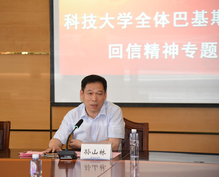 为深入学习贯彻习近平总书记给北京科技大学全体巴基斯坦留学生回信精神,5月26日下午,我校在飞天楼517会议室召开了专题学习会议。副校长孙山林出席会议,宣传部、学生工作部、国际教育学院相关负责人、对外汉语教师代表、在校来华留学生代表参加会议。