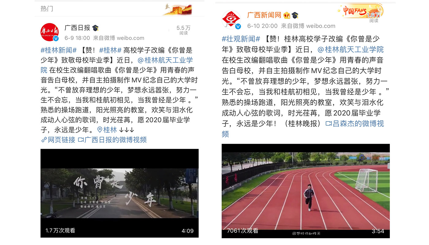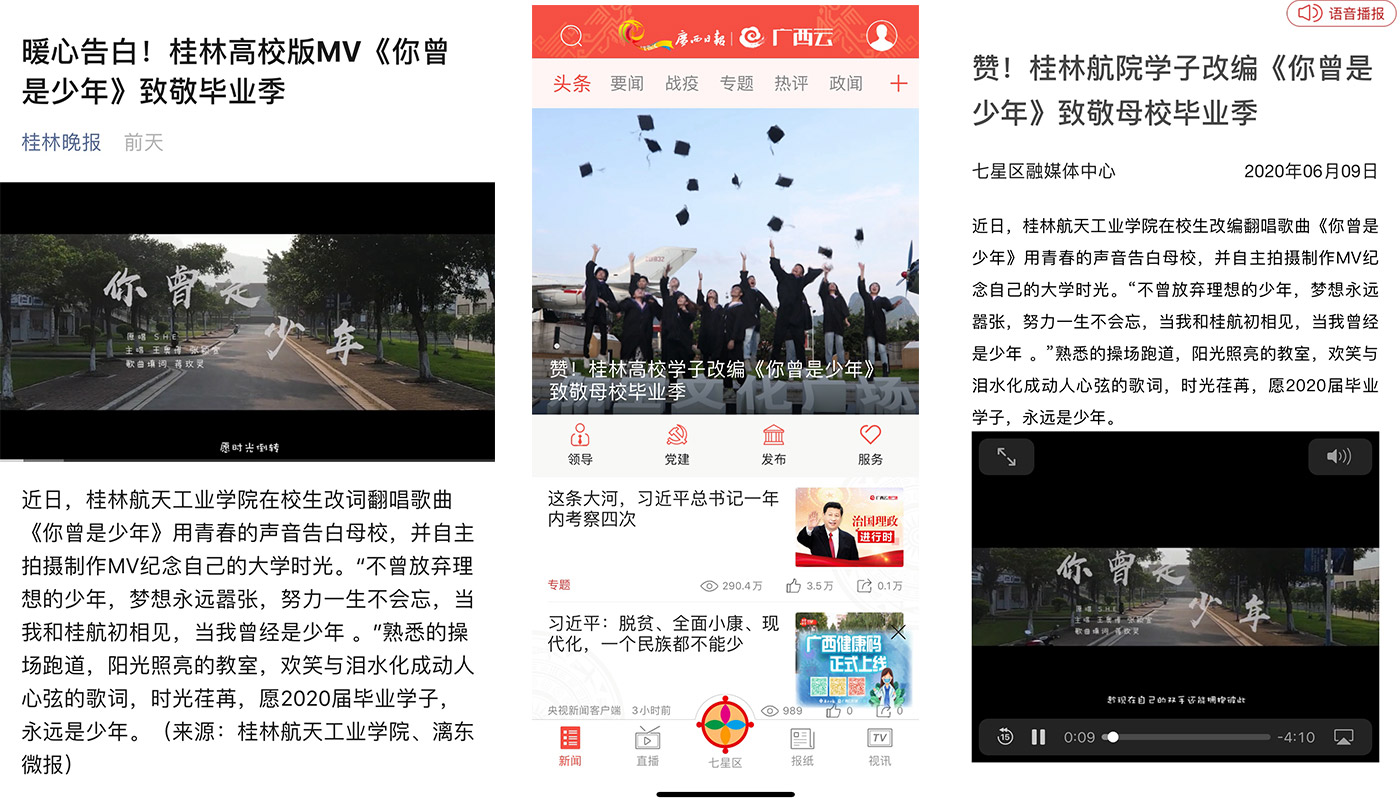 近日,我校在校学子改编翻唱《你曾是少年》用青春的声音告白母校,并自主拍摄制作毕业季MV纪念自己的大学时光。人民网、学习强国、广西日报、广西新闻网、桂林晚报、桂林生活网等多家媒体报道和转载了该原创视频。据统计,视频发布3天以来,各平台累积播放量已超20万。