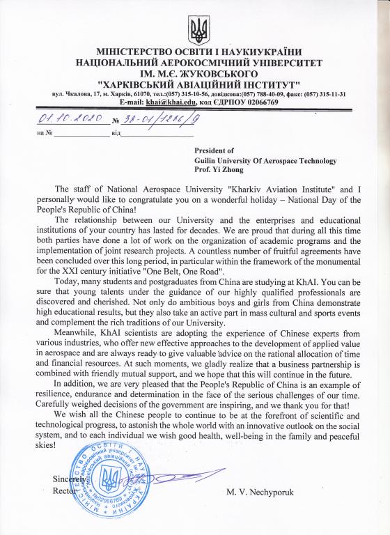 在中华人民共和国71周年华诞之际,与我校友好交往的乌克兰哈尔科夫国立茹科夫斯基航天航空大学(以下简称“哈航”)向我校发来贺信,祝贺中华人民共和国成立71周年,并向我校全体教职员工致以节日祝贺。
