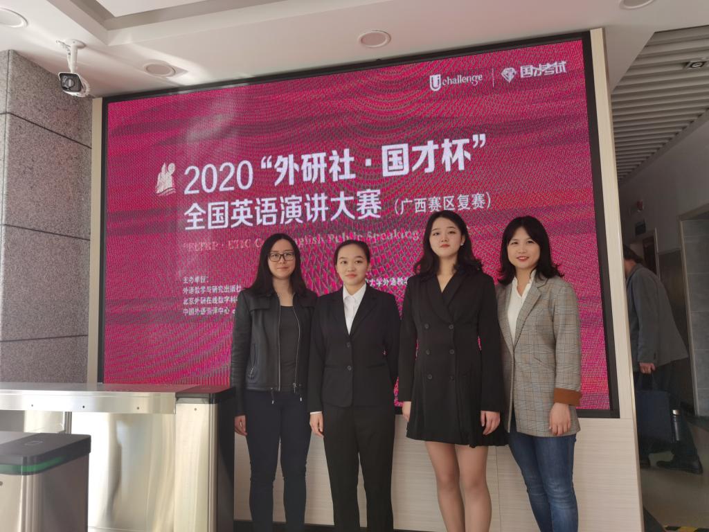 11月8日,由我校外语外贸学院陈林林老师和陈诗霏老师指导的黄潇涟和郑慧颖同学在“外研社·国才杯”全国英语演讲大赛广西赛区复赛中荣获二等奖。此次比赛成绩也是我校近年来英语类演讲比赛的最好成绩。
