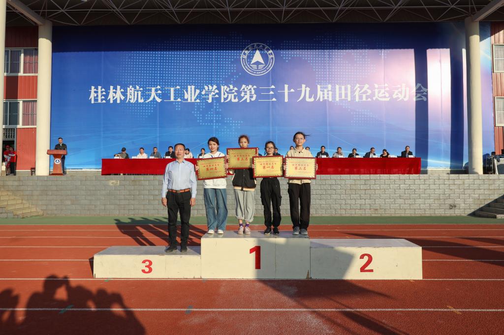 本次田径运动会总裁判长高大千宣布本届运动会的竞赛成绩:电子信息与自动化学院以258分摘得男女团体桂冠,能源与建筑环境学院和机械工程学院分列亚季军。学校领导分别为获奖的集体颁奖。