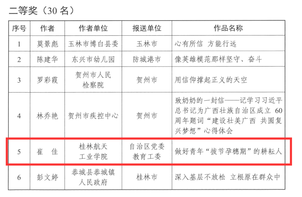 近日,自治区党委宣传部、党委组织部公布了“我喜爱的学习金句”学习习近平新时代中国特色社会主义思想体会征文活动获奖名单,我校教师崔佳的作品《做好青年“拔节孕穗期”的耕耘人》喜获二等奖。
