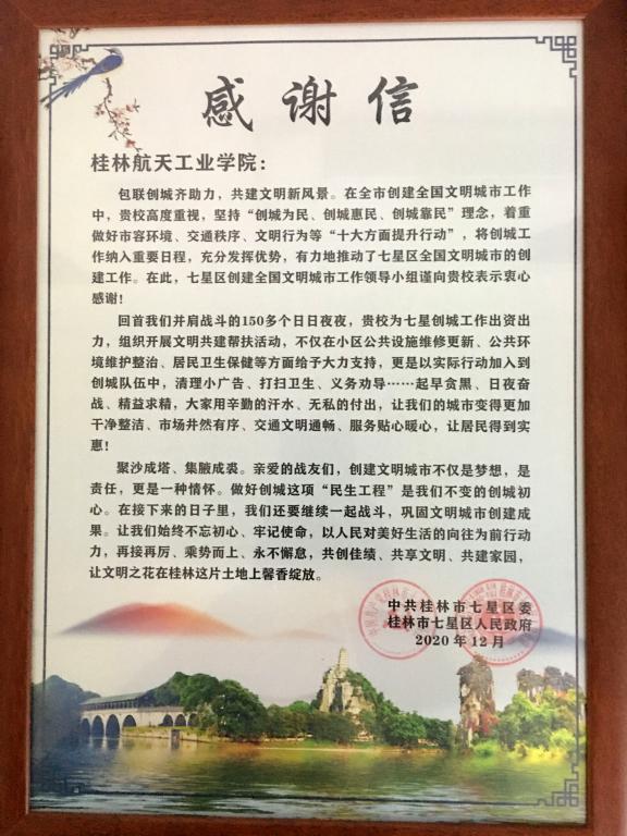 易忠校长代表学校祝贺桂林市获得全国文明城市荣誉称号,对学校能够为创城工作作出应有的贡献感到十分光荣,并表示将一如既往地配合好地方政府,做好创城及相关工作。易忠感谢七星区委区政府领导历年来对我校强有力的支持,感谢七星区为学校办学规模的扩大和校园周边建设发展做出的积极贡献,希望七星区能够继续给予我校大力支持,共同促成校地深度合作、双方发展共赢的良好局面。