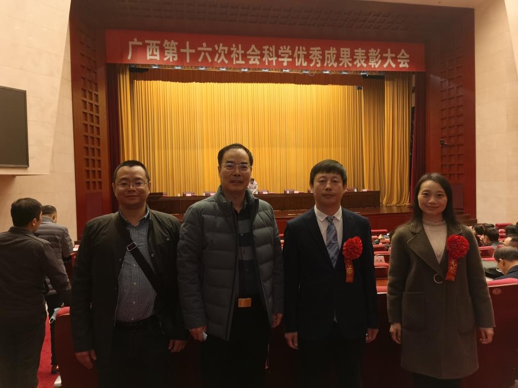 近日,广西第十六次社会科学优秀成果表彰大会在南宁市自治区党委礼堂隆重召开。我校张立国教授的专著《效率视角下中国物流业能源消耗与二氧化碳排放研究》获广西第十六次社会科学优秀成果著作类三等奖,刘思彤老师撰写的论文《知识图谱视角下我国民族地区舆情研究演化与热点分析》获广西第十六次社会科学优秀成果论文类三等奖,两人作为获奖代表受邀参加本次表彰大会。我校党委副书记刘迎春、学校社科联秘书长黄涛作为获奖单位代表参加了表彰大会。