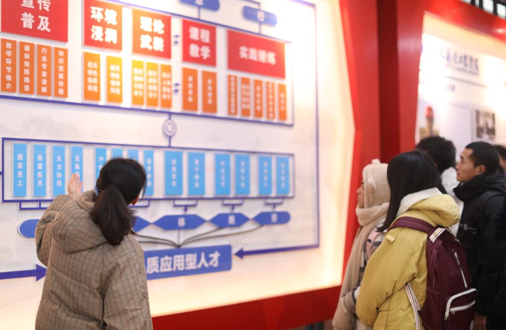 在北校区航天博物馆, 展出的包括歼20、歼31在内的战斗机模型、巨大的鲲鹏Y-20运输机模型、大型客机C919模型等中国航天的标志性飞行器模型展品,吸引了观众们的目光。一架由中国载人航天办公室主任、“中国飞天第一人”杨利伟将军和中国工程院院士戚发轫、刘永才等联合签名的飞机模型展品引得前来参观的小学生代表纷纷“打卡”留念。我市龙隐小学五年级的小学生代表黄晞婼说,自己第一次看到这么多火箭模型,原来神秘的宇宙是这么有意思。