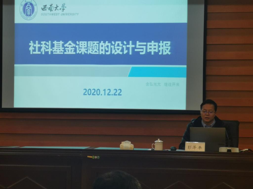 12月22日下午,西南大学教育学部副部长、博士生导师彭泽平教授莅临我校,在南校区飞天楼520会议室为我校教师作题为《社科基金课题的设计与申报》学术指导讲座。讲座由科技处副处长黄涛主持,全校100余名教师聆听了讲座。