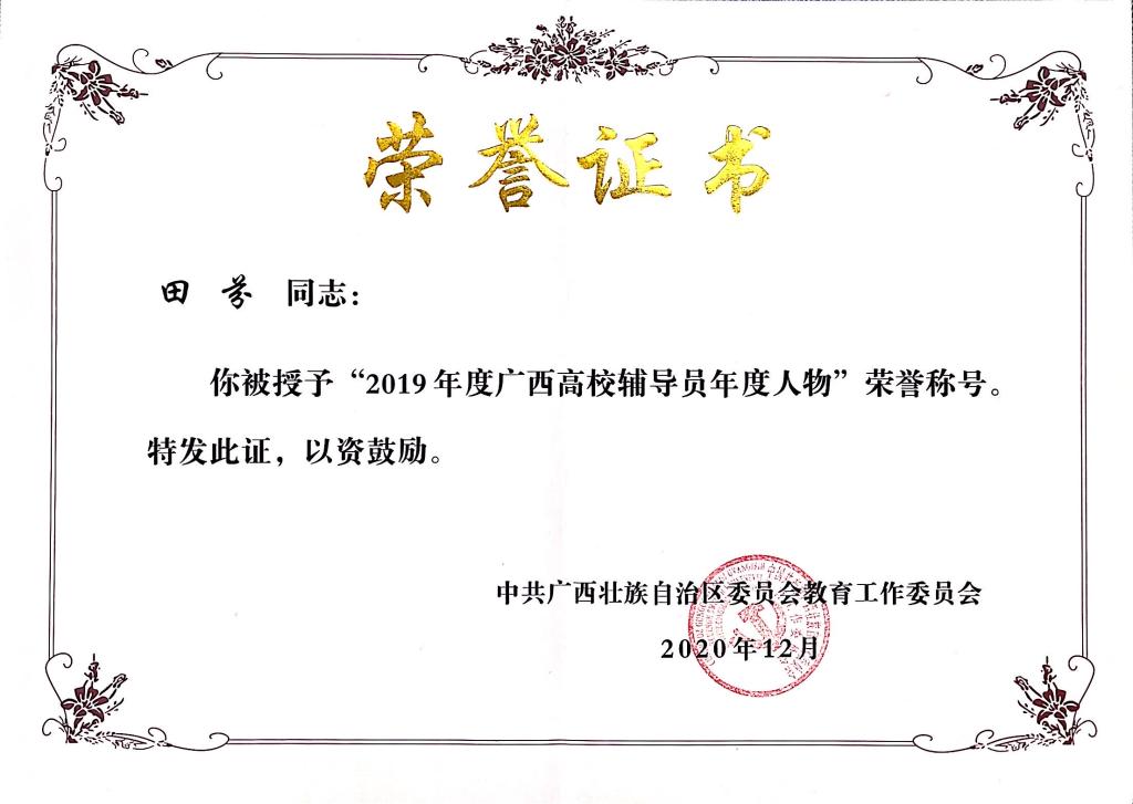 近日,由中共广西壮族自治区委员会教育工作委员会主办的“2019年度广西高校辅导员年度人物”评选活动结果揭晓,我校电子信息与自动化学院辅导员田芬荣获“2019年度广西高校辅导员年度人物”荣誉称号。