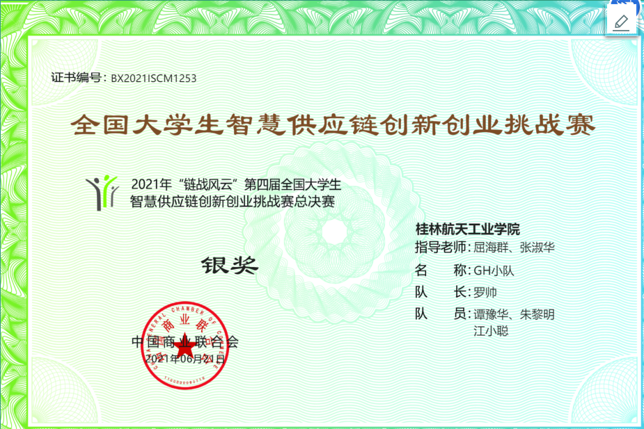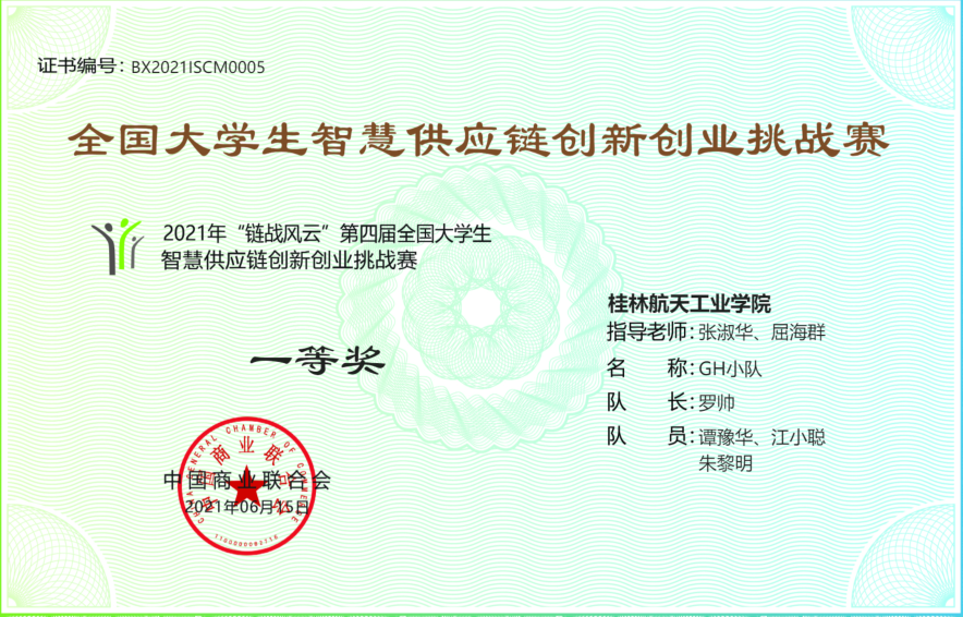 从2021年4月活动报名启动以来,我校组织了范围广、层次多、质量高的校内选拔赛。管理学院物流管理本科专业领队老师从职业技能测评、运营对抗和方案规划与决赛方案解说的视频录制等方面对参赛队员进行深入细致辅导。此次比赛,全国共有250所本科院校的427支队伍参赛,经过激烈角逐,50支队伍晋级总决赛。我校管理学院2018级物流管理专业的4名学生组成的“GH小队”在比赛过程中努力拼搏、沉着应对,结合个人特长,发挥团队协作能力,将队伍实力充分展现,冲出重围,以挑战赛全国排名第2的成绩顺利晋级全国总决赛。在带队老师屈海群和张淑华的指导下,最终以排名全国第15名的优异成绩喜获本科组全国总决赛“银奖”。我校参赛队伍在自选行业运营中,以97.055分的成绩摘得物流运营第一名,被大赛组委会另授予“最佳物流商创新创业奖”。参赛队员荣获百碟教育职业能力认证委员会颁发的“《供应链管理》理实一体化课程职业技能合格证书”。