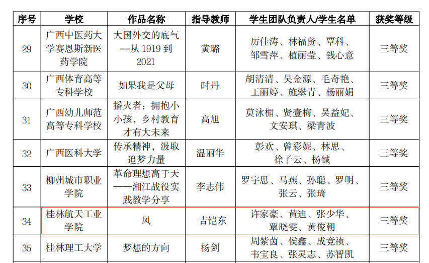 我校马克思主义学院潘梅华教师指导张帆、黎子菁、覃爱华、季巧、朱桂盛5位学生参加全区高校大学生讲思政课公开课展示活动荣获二等奖;马克思主义学院吉铠东教师指导许家豪、黄迪、张少华、覃晓雯、黄俊朝5位学生参加全区高校大学生微电影展示活动荣获三等奖。