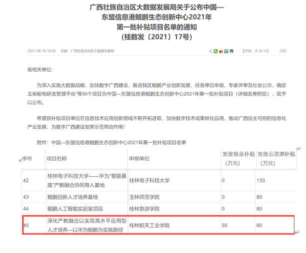 近日,广西壮族自治区大数据发展局印发了《关于公布中国—东盟信息港鲲鹏生态创新中心2021年第一批补贴项目名单的通知》(桂数发〔2021〕17号),共有50个项目获得专项补贴。由我校计算机科学与工程学院牵头申报的《深化产教融合以实现高水平应用型人才培养—以华为鲲鹏为实施路径》项目获得专项补贴金额130万元。
