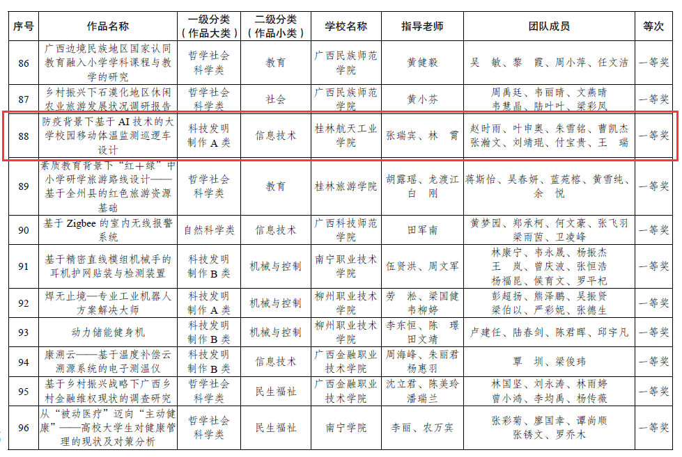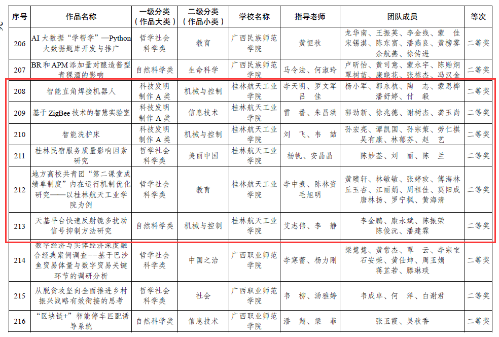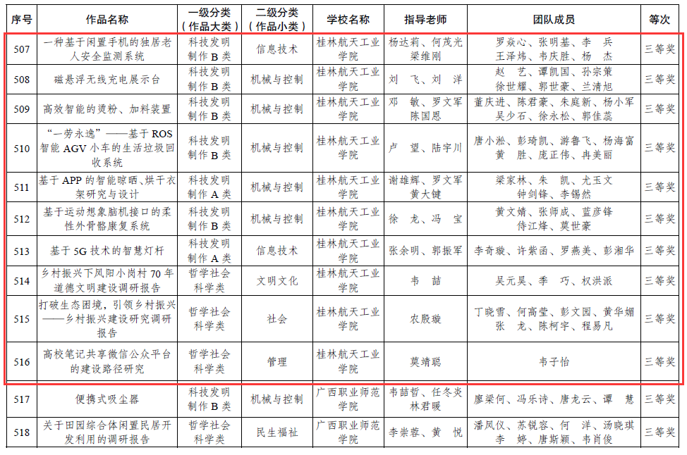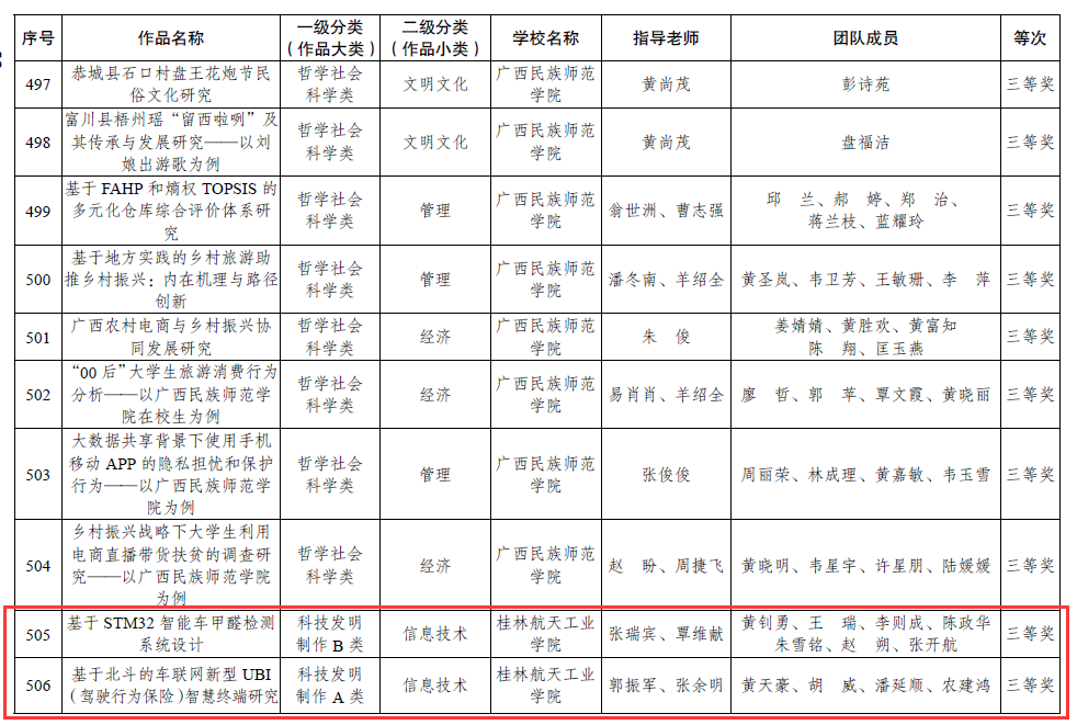 近日,由共青团广西区委、区教育厅、区科技厅、区科学技术协会和区学生联合会共同主办的第十届“挑战杯”广西大学生课外学术科技作品比赛结果正式公布,我校推荐的25件参赛作品中19件作品获奖:其中一等奖1项、二等奖6项、三等奖12项。