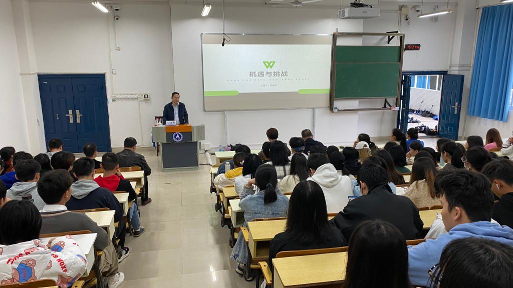 11月4日下午,中国化学工程第四建设有限公司广西分公司孙建书总经理应邀来校做“机遇与挑战”专题讲座。外语外贸学院主要负责人、师生代表200余人聆听了讲座。