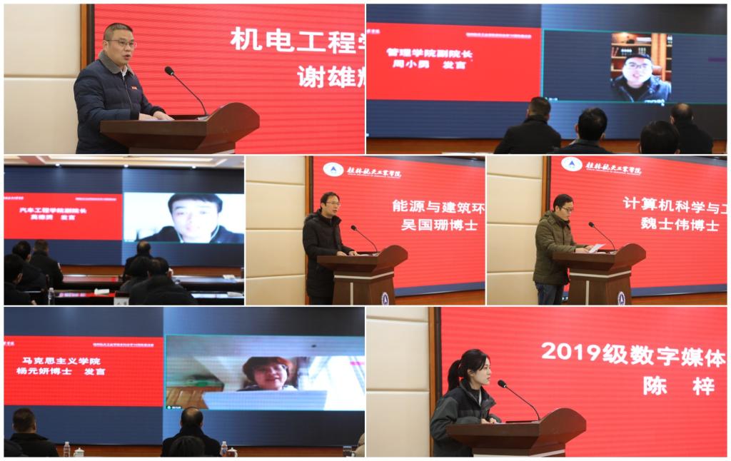 学校第一批升本专业所在学院负责人谢雄辉、周小勇、莫德赟,优秀教师代表吴国珊博士、魏士伟博士、杨元妍博士,在校生代表、2019级数字媒体技术专业陈梓同学分别通过线上、线下的方式作了发言,表达了全校师生员工不忘初心,励精图治,开拓进取,再创辉煌,为学校的发展壮大做出更大贡献的雄心壮志。