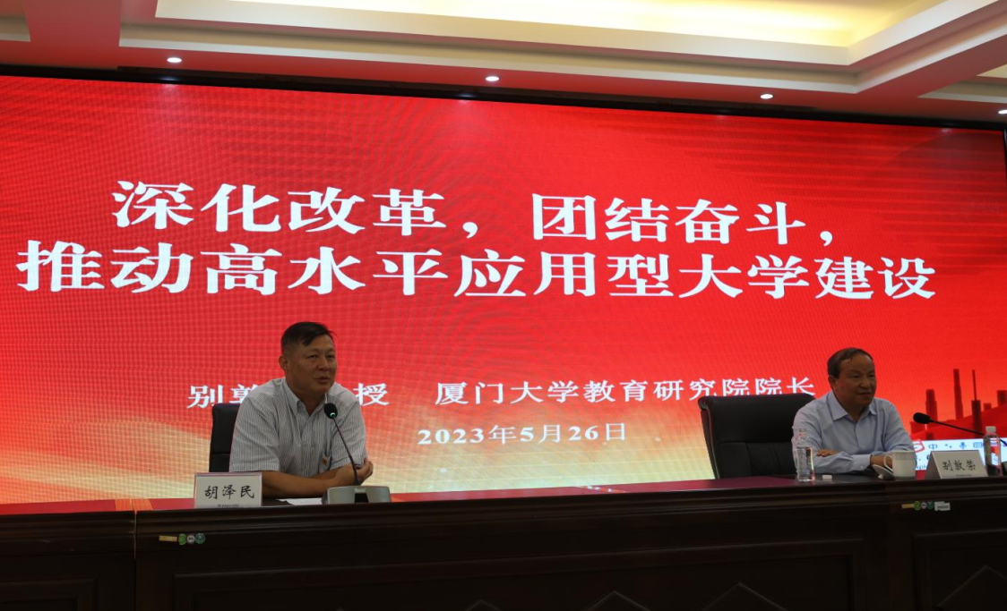 按照学校学习贯彻习近平新时代中国特色社会主义思想主题教育工作安排,5月26日,学校邀请到厦门大学教育研究院院长别敦荣教授,在飞天楼520会议室作《关于高水平应用型大学建设面临的形势、任务和战略》专题讲座。校党委常委、副校长胡泽民主持,全体在家校领导、中层干部参加了此次讲座。