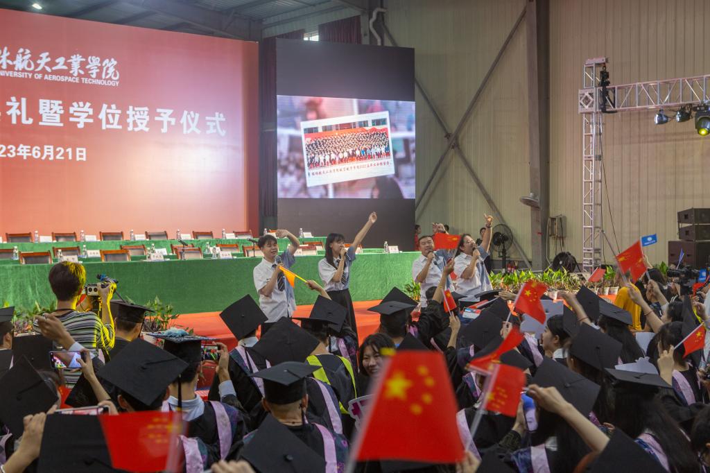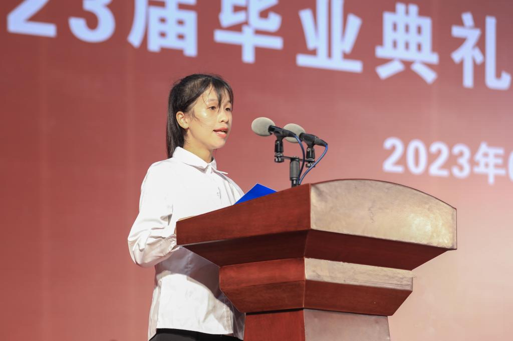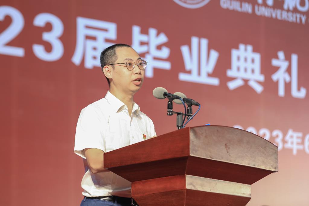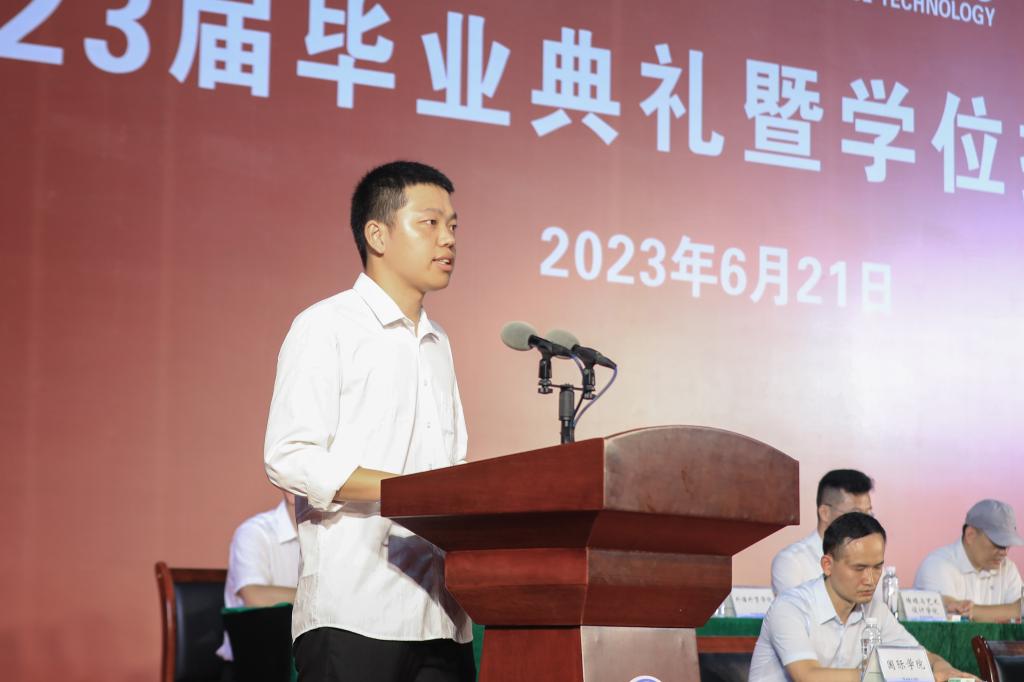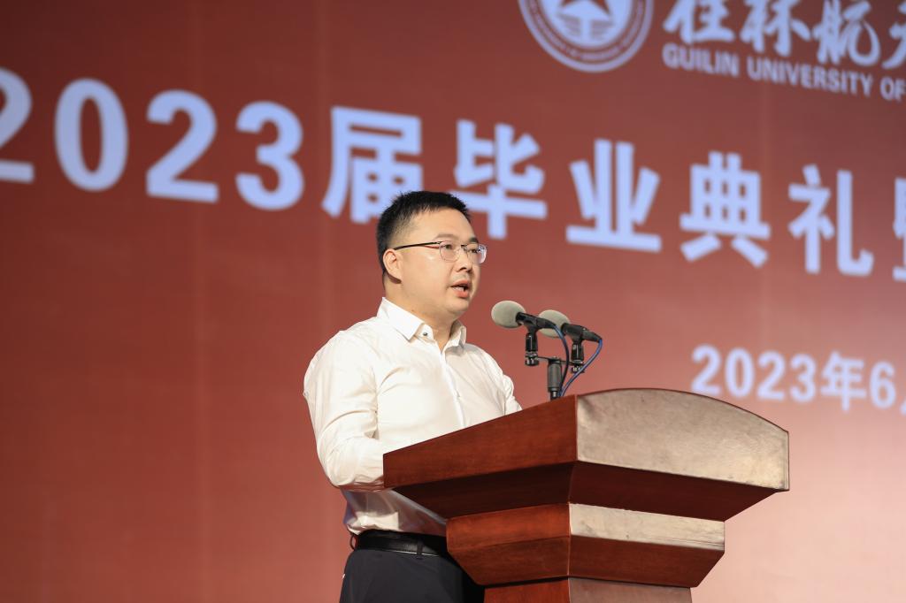 管理学院教师杨帆代表全体教师向毕业生们致以最衷心的祝贺,祝愿他们在未来迎接挑战的道路上一鸣惊人、一飞冲天;航空宇航学院2019级飞行器制造工程专业的李洋代表全体毕业生感谢母校的悉心教导;理学院2020级数据科学与大数据技术专业的韦晶作为在校生代表向毕业生们表达真挚祝愿,以他们为榜样,秉承“尚德博学,慎思笃行”的桂航校训,践行“艰苦奋斗,自强日新”的桂航精神,把桂航的明天续写得更加辉煌。